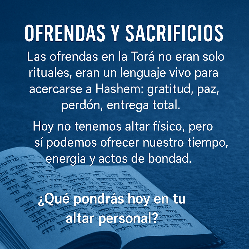 Hoy ya no tenemos el Beit HaMikdash ni un altar donde llevar ofrendas físicas, pero eso no significa que la enseñanza desapareció. Cada día es una oportunidad única para “ofrecer” lo mejor de ti: tu tiempo, tu energía, tu compasión, tu disciplina. Lo urgente es no esperar a que sea demasiado tarde para dar. La vida misma es un altar, y cada acto de conciencia es un sacrificio que construye bendición.