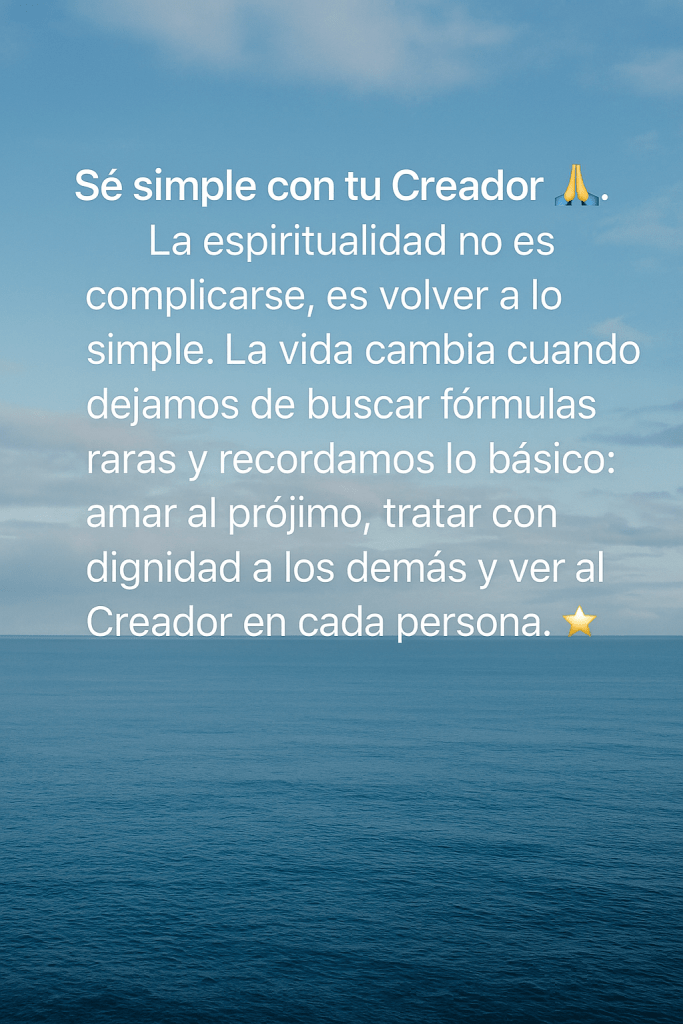 La vida espiritual no tiene por qué ser complicada. De hecho, cuando entendemos su esencia, descubrimos que el verdadero valor está en la sencillez. Y aquí hay algo que vale la pena recordar: cada vez que nos acercamos al Creador desde lo simple, sin máscaras ni adornos, estamos creando un espacio de reciprocidad con la Luz. El regalo que damos es nuestra autenticidad; lo que recibimos de vuelta es bienestar, claridad y fuerza para vivir con propósito.